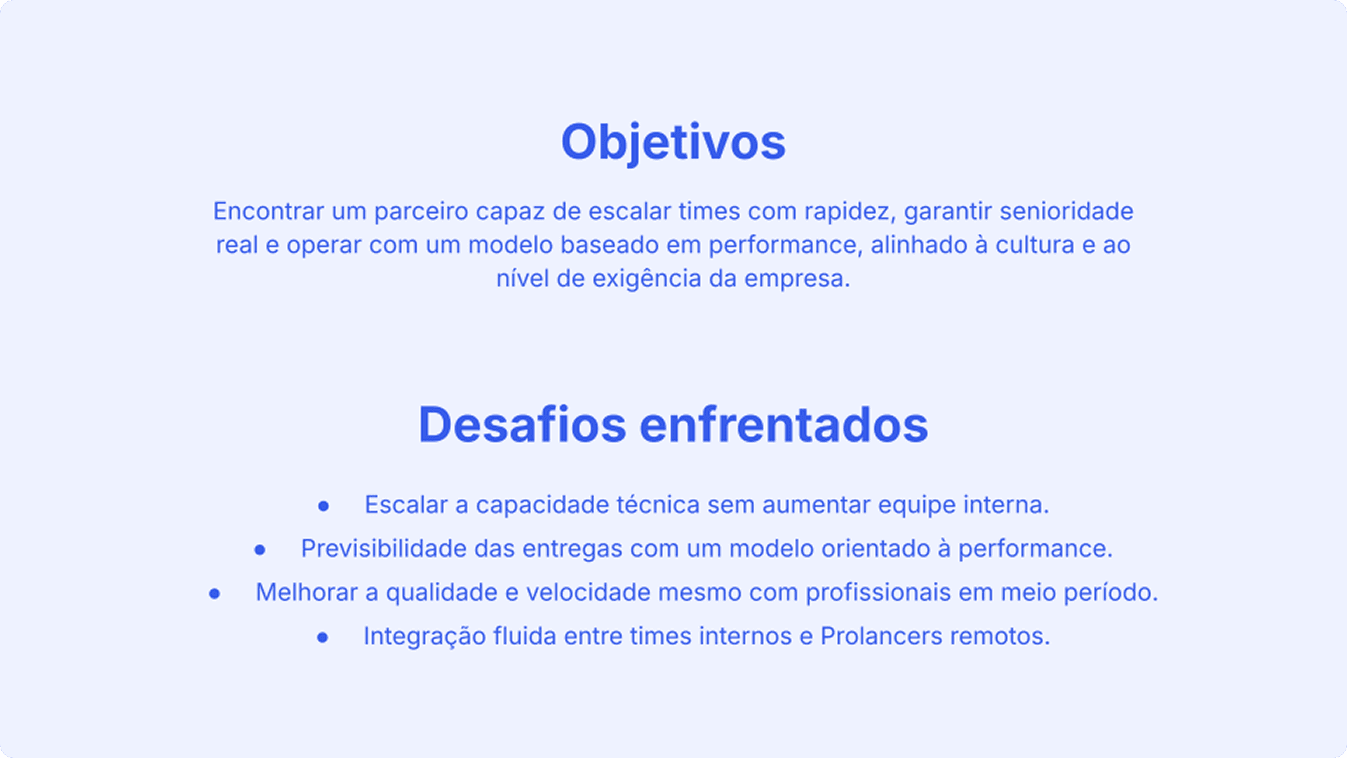 A parceria foi estruturada para alocar profissionais em squads dedicados, com gestão compartilhada entre as duas empresas e foco em projetos específicos. Diferentemente de experiências anteriores, o contrato baseado em performance trouxe segurança e alinhamento de expectativas, enquanto o fornecimento de profissionais realmente seniores elevou o padrão de entrega, evitando o desalinhamento comum em fornecedores que prometiam senioridade, mas entregavam perfis mais juniores.